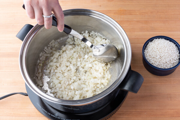 Add the rice and stir constantly until the rice is toasted and warm.