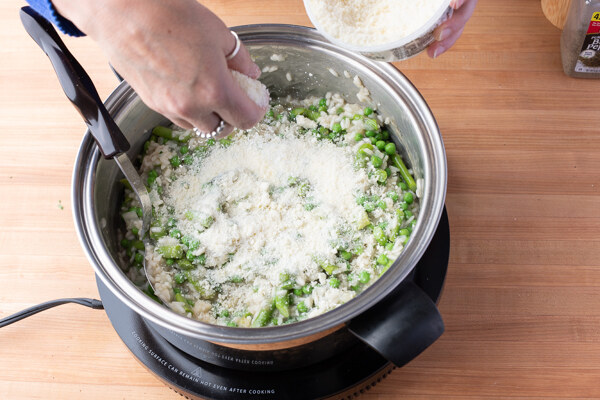 When the risotto is cooked (the rice should be mostly soft with a small bite), add some butter and Parmesan cheese to finish the dish.