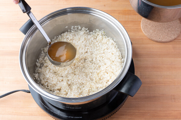 Add warmed broth one ladle at a time, stirring constantly, cooking down the liquid until it’s absorbed. You want the rice to be plump with a creamy sauce.