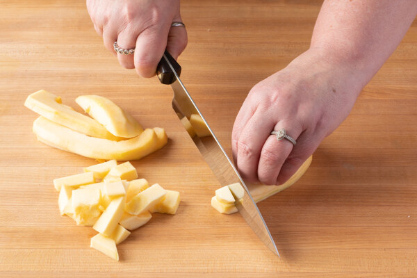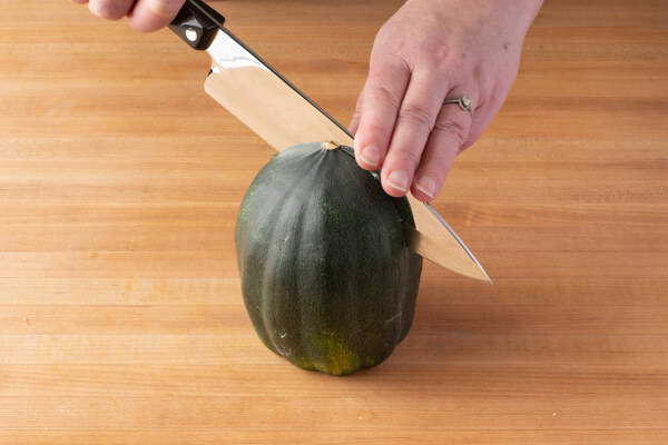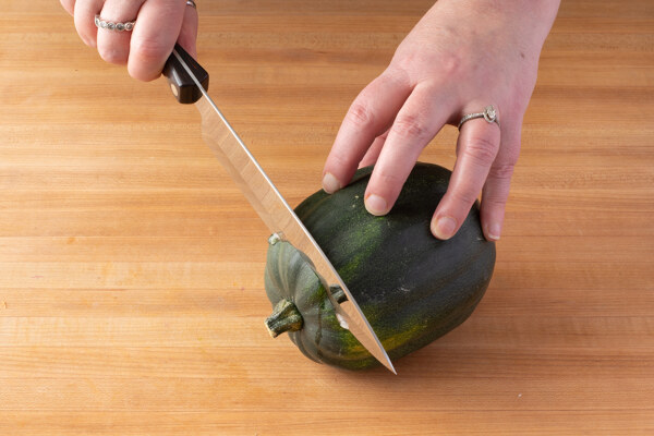 Using a 7-5/8" Petite Chef knife, slice off the stem end of the squash.