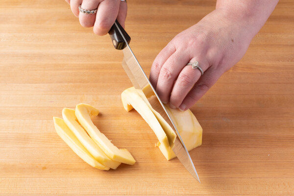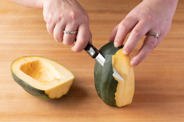 Stand the squash half upright and flat on the cutting board and trim off the skin with a 2-3/4" Paring Knife.
