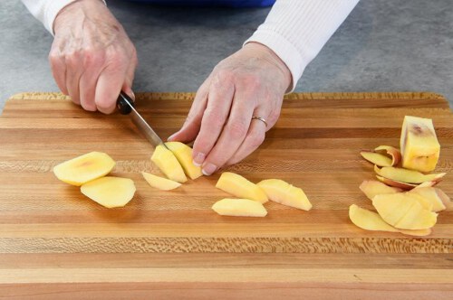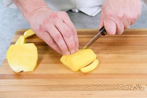With the avocado resting on a cutting board, use a 4" Paring Knife to cut around the radius of the avocado lengthwise, down to the seed.