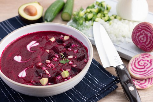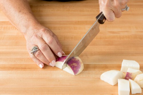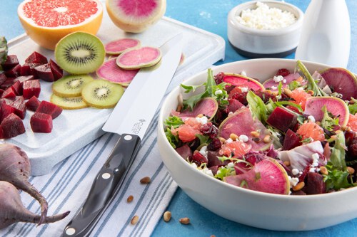 A hardy vegetable requires a hardy knife. The Hardy Slicer’s hefty blade and sharp, Double-D® edge power through dense vegetables, like beets, for easy prep.
