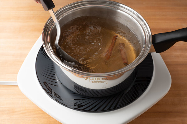 In a 3-Qt. Saucepan over medium heat, add the water, vanilla, sugar, cinnamon sticks, and nutmeg.