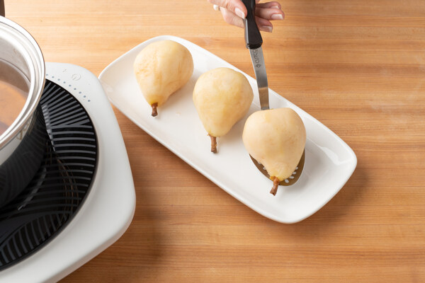 When poaching a pear, a paring knife with a longer blade works best. Use the 4" Paring Knife to peel the fruit and then slice it when it’s done.
