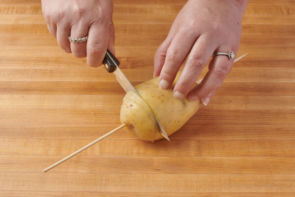 Using a 4" Paring Knife, start at one end of the potato, angle the knife and carefully start cutting down through the potato to the skewer. Rotate the skewer and continue cutting, moving the knife down the length of the potato creating 1/4" slices.