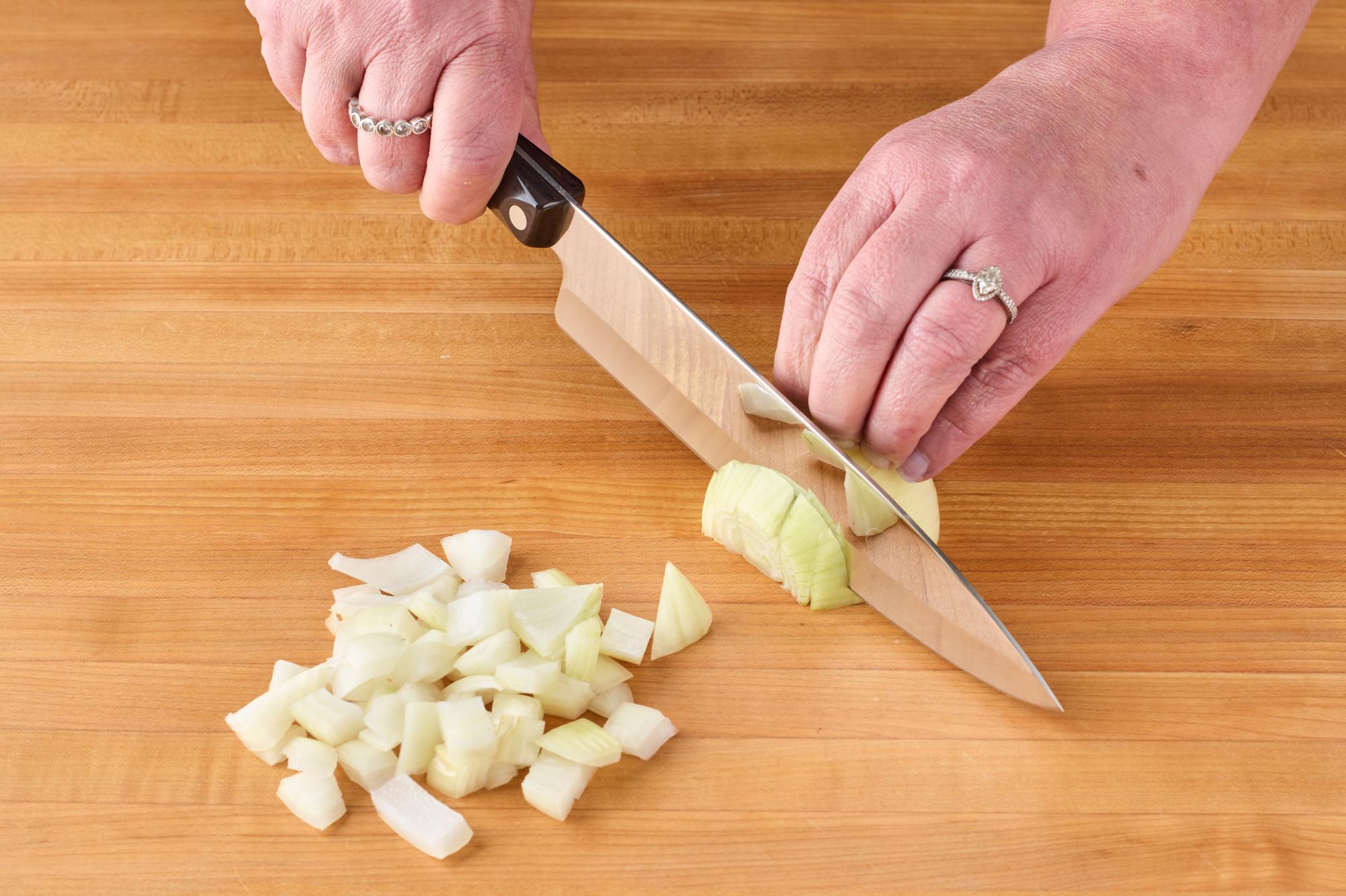 Use a 7-5/8″ Petite Chef knife to chop the onion into bite-sized pieces. I like to keep them somewhat chunky to add to the texture of the soup.