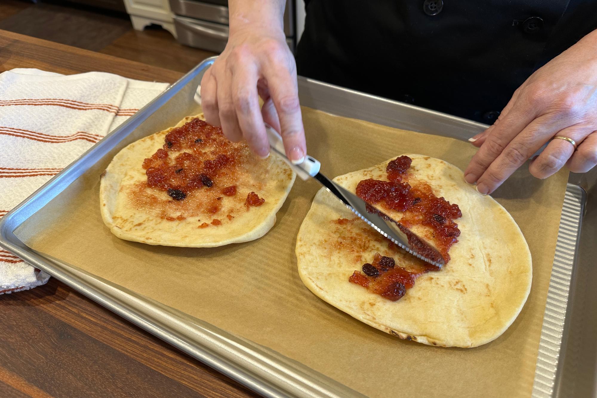 Before adding any toppings, place the flatbread in a 400 F oven for three to four minutes, just to warm up. Stir the F.R.O.G. jam, then use a Spatula Spreader to spread it onto the warm bread as the base.