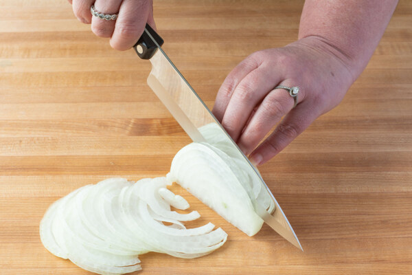 Using a 7-5/8" Petite Chef, thinly slice two large onions.