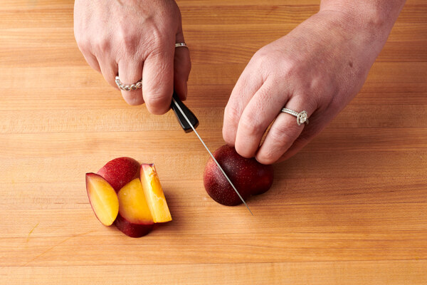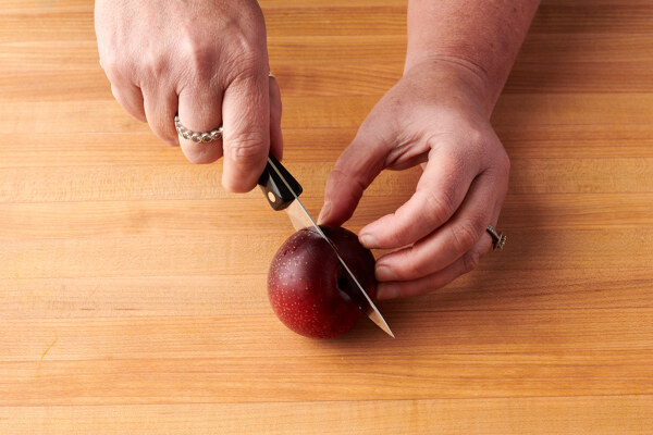 Use a 4" Gourmet Paring Knife to carefully cut around the circumference of the plum from the stem-side down.