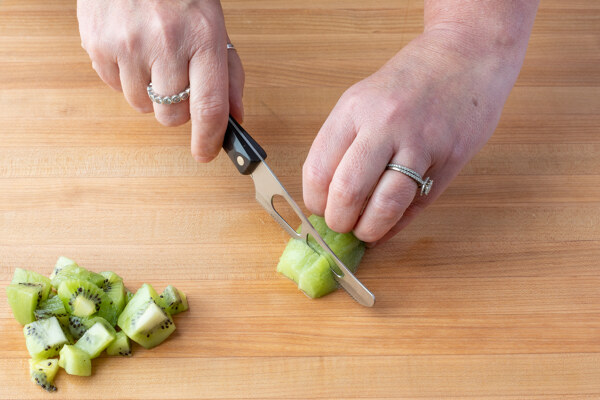 Rotate the kiwi 90 degrees and cut crosswise to dice.