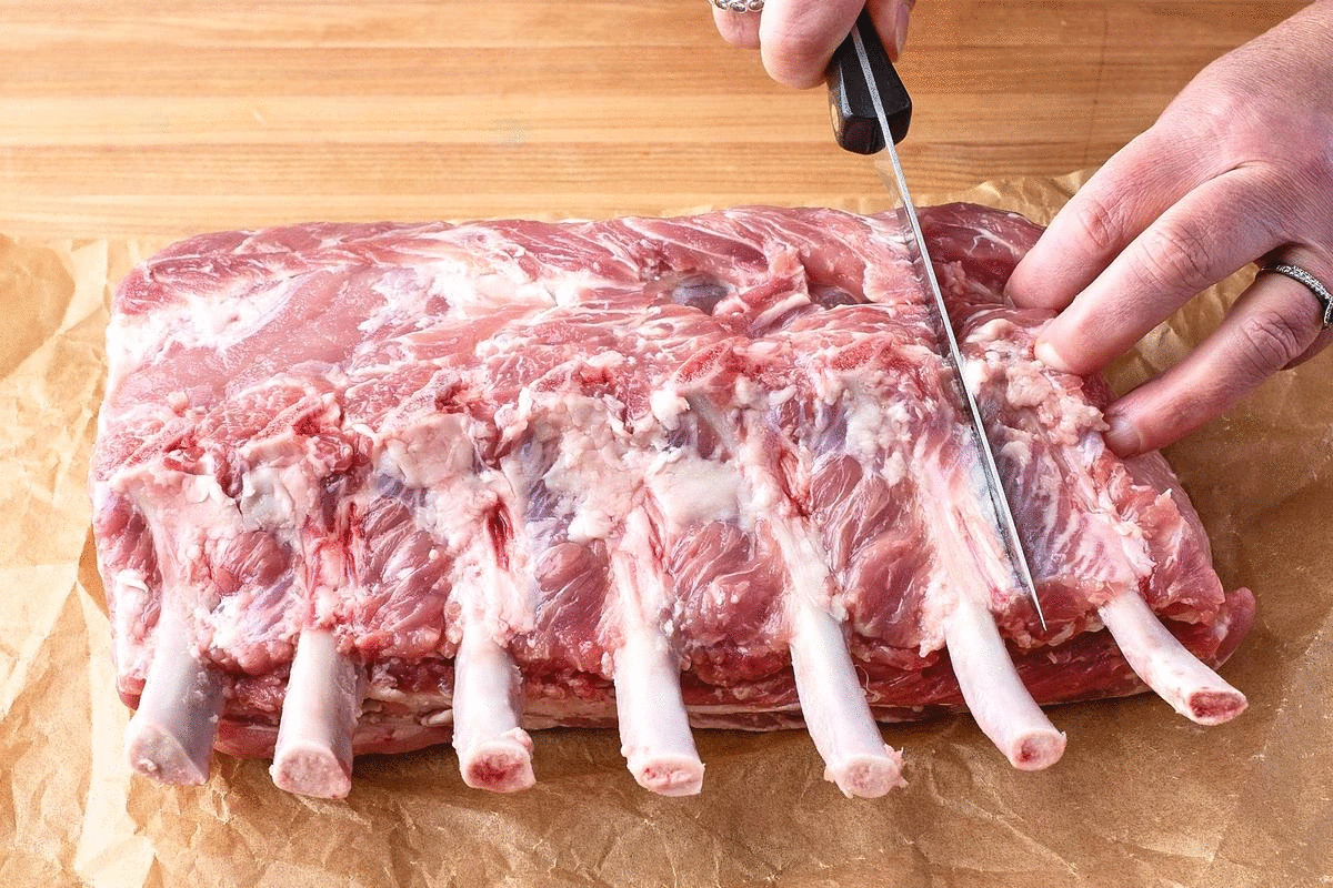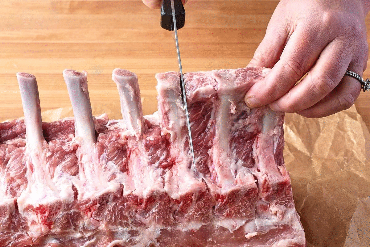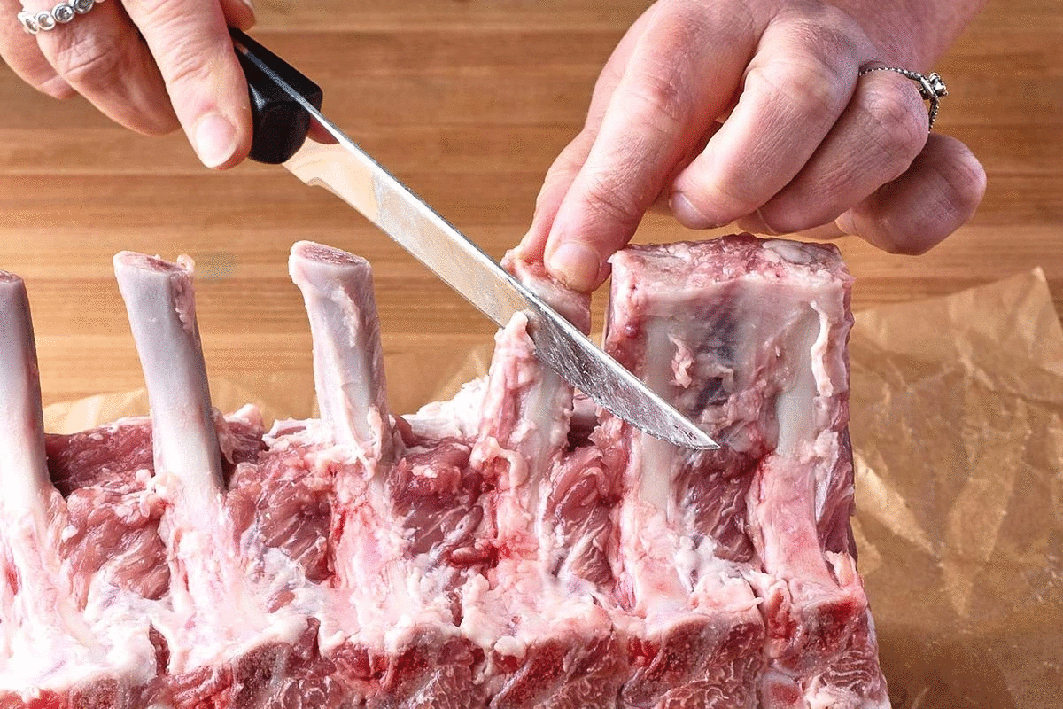 Prep with two rib roasts. Using a Boning Knife, trim the meat from each bone cutting away enough meat to expose the bones. Show Me How