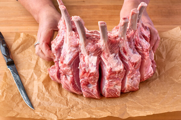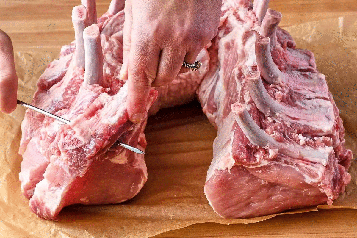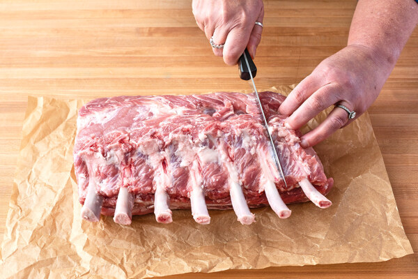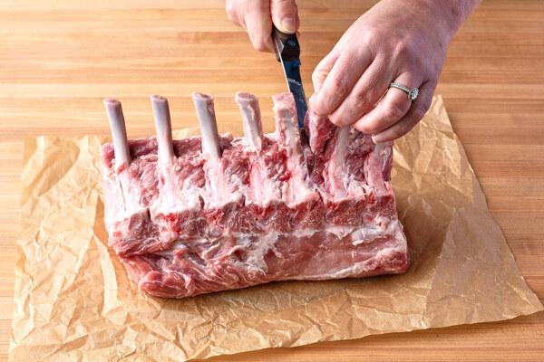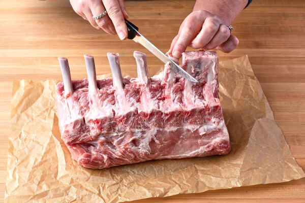 Lay the pork loins down with the bone side up. Make a shallow vertical cut through the meat halfway between each bone. Your cuts should extend from the bottom of the meat up between each bone to the top of the meat. This will allow you to bend the meat to form a crown. Show Me How
