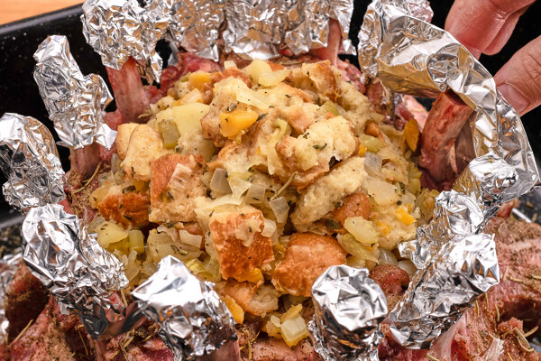 Season the crown roast, fill the inside with the stuffing and cover the ends of the bones with foil so they don’t burn while roasting.